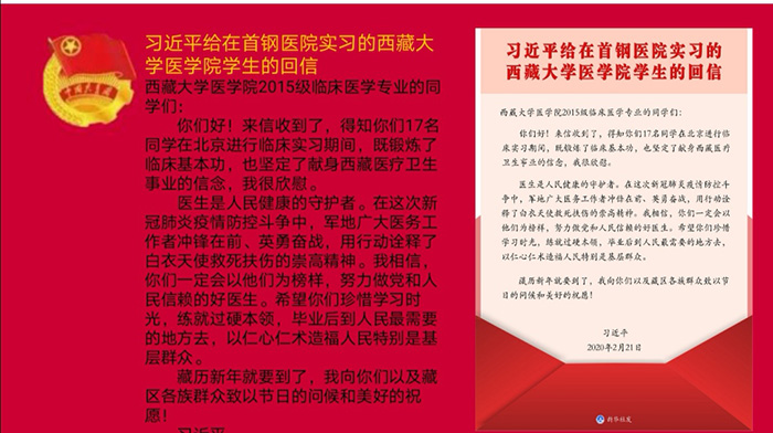 下午3时,来自2019级新闻采编与制作(1)班的团支书刘敏莉在深入了解该活动内容及要求后,组织该班全体学生线上开展此次活动。她向同学们展示了国家主席习近平给在首钢医院实习的西藏大学医学院学生的回信及习近平勉励北京大学援鄂医疗队全体“90后”党员的回信。刘敏莉感概道:“习近平对青年先锋模范的回信字字恳切,这也是对当代所有青年的勉励,同学们应谨记习近平的话语,跟随党的方向。以这些同龄人为骄傲,向他们学习。”随后,该班的同学们在班级群中踊跃发言表示认同,班长王梓璇感言:“江河万里总有源,树高千尺也有根,作为当代青年要坚定不移的走中国特色社会主义道路。”