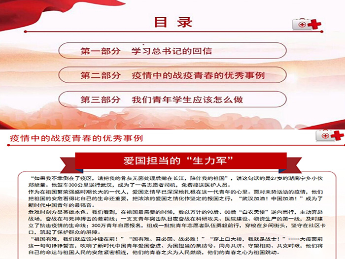 与此同时,2019级物业管理班的团支书杨惊涛正在与同学们讲述疫情中战役青春的优秀事例:“如果我不幸倒在了疫区,请把我的骨灰无菌处理后撒在长江,陪伴我的祖国。”这是来湖南宁乡的27岁小伙郑能量在此次疫情中表现出的决心,他驾车300公里逆行武汉,成为了一名志愿者司机,免费接送医护人员。同学们听完他的事迹纷纷赞叹不已,在这场人民战“疫”中,以郑能量为代表的广大青年用实际行动充分证明,他们是有远大理想的一代,是有家国情怀的一代,更是能担当大任的一代。 此次活动旨在让同学们进一步了解国家的制度优势,坚定制度自信。勇于担当时代赋予的责任,发扬五四精神,让青春在使命中绽放,争做有理想、有担当的新青年。(图文/系学生会新闻部黄文静、高鑫悦 审核/杨健、韩芳勤) |