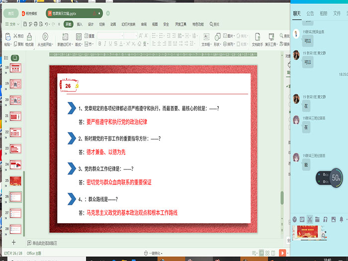 为巩固入党积极分子党章学习的效果,活动还安排了知识竞答环节。“党的群众纪律是什么?”黄安格抛出了第一个问题,该系部2019级新闻采编与制作(3)班的纪苗苗踊跃回答道:“是密切党和群众血肉联系的重要保证。”紧接着,黄安格提出下一个问题:“党的性质是什么?”该系部2019级新闻采编与制作(2)班的阚朝阳抢答道:“中国共产党是中国工人阶级的先锋队,同时是中国人民和中华民族的先锋队,是中国特色社会主义事业的领导核心,代表中国先进生产力的发展要求,代表中国先进的前进方向,代表中国最广大人民的根本利益。”同学们积极的态度,准确的回答得到了其他入党积极分子的认可和称赞。