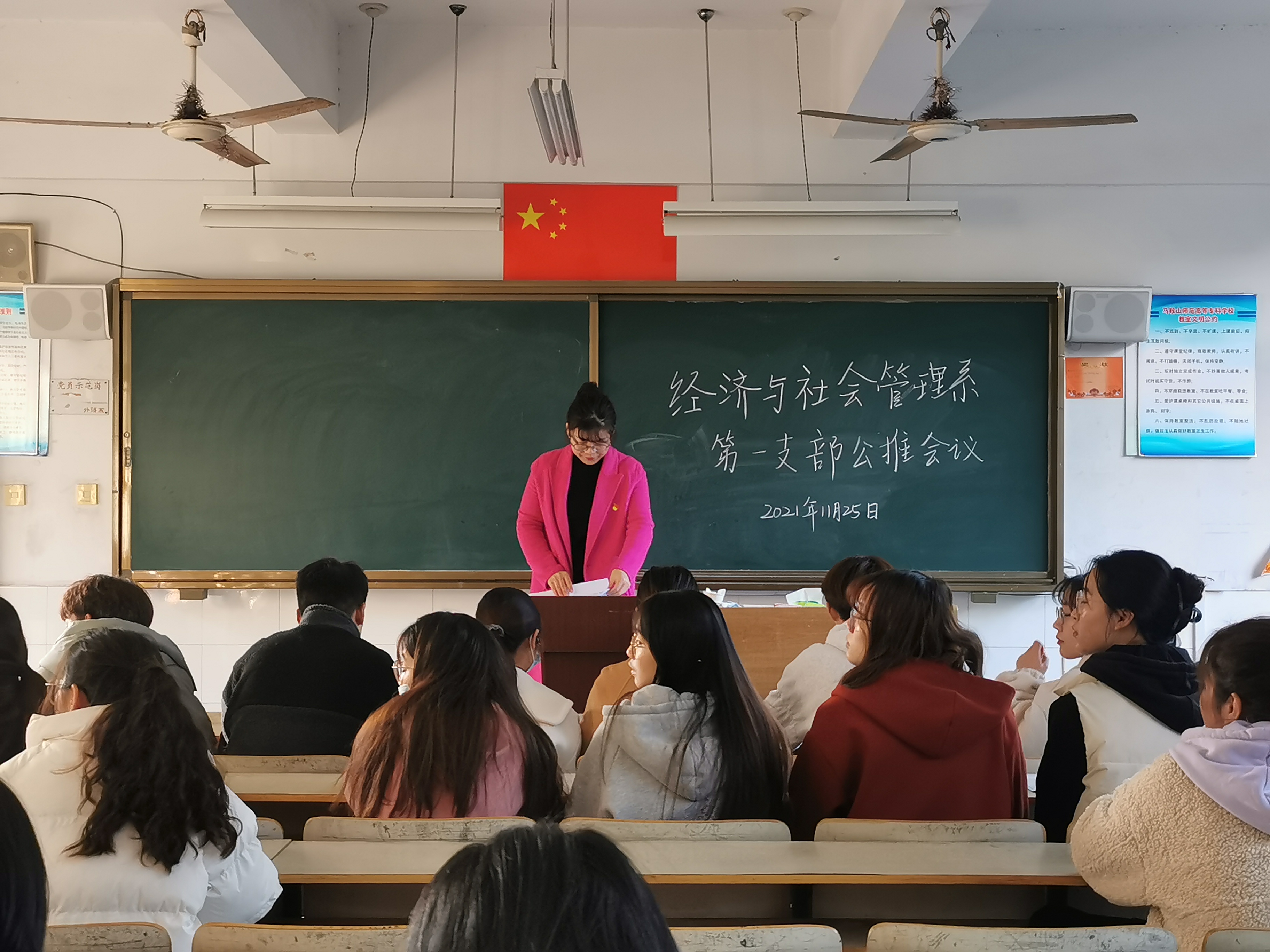 经济与社会管理系第一党支部召开公推会议 本网讯 11月25日下午,经济与社会管理系第一党支部在D205教室组织召开了2021年下半年公推会议。会议由支部书记曹本霞老师主持,支部党员,辅导员但德阳、陈月婷和群众代表参加了本次会议。