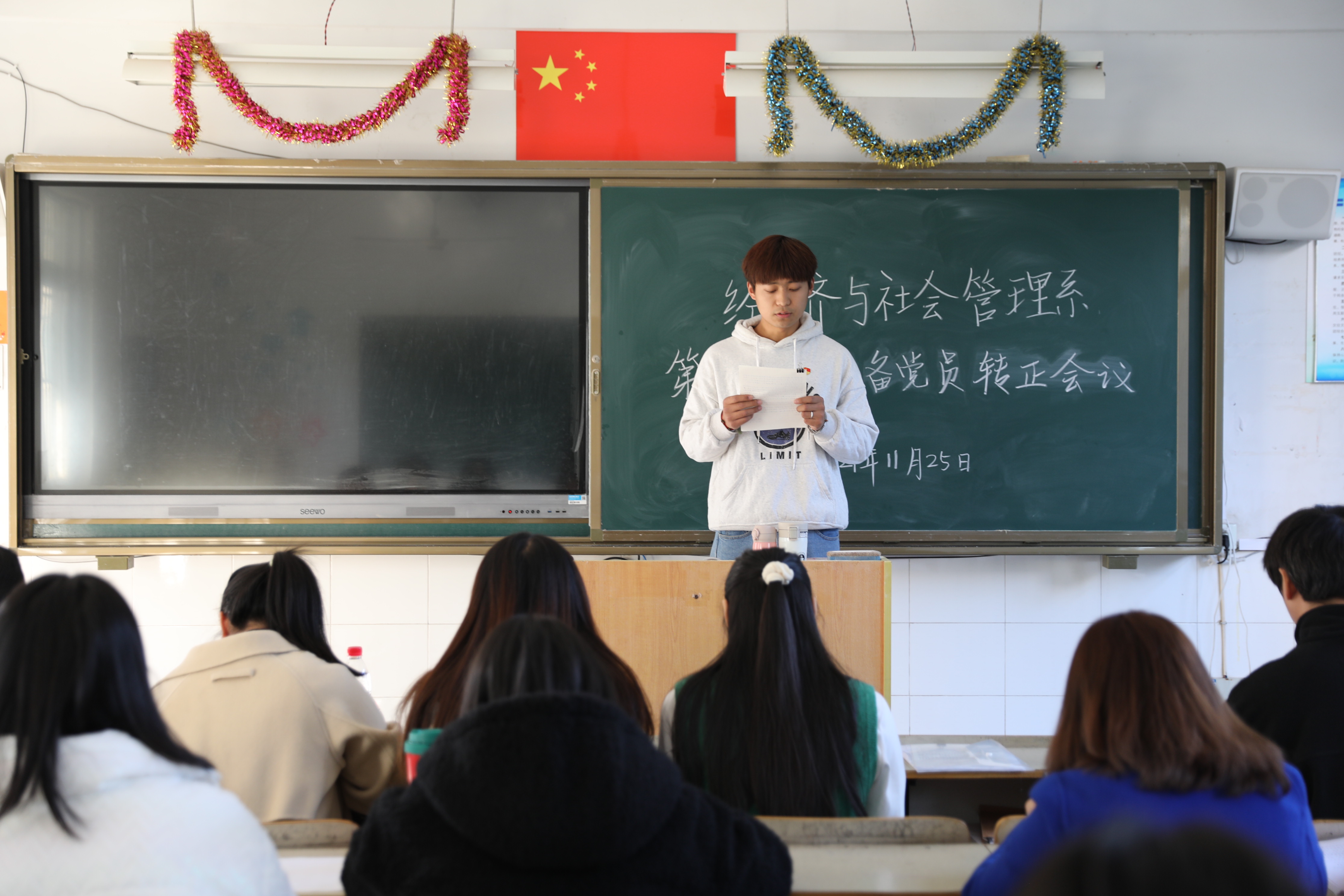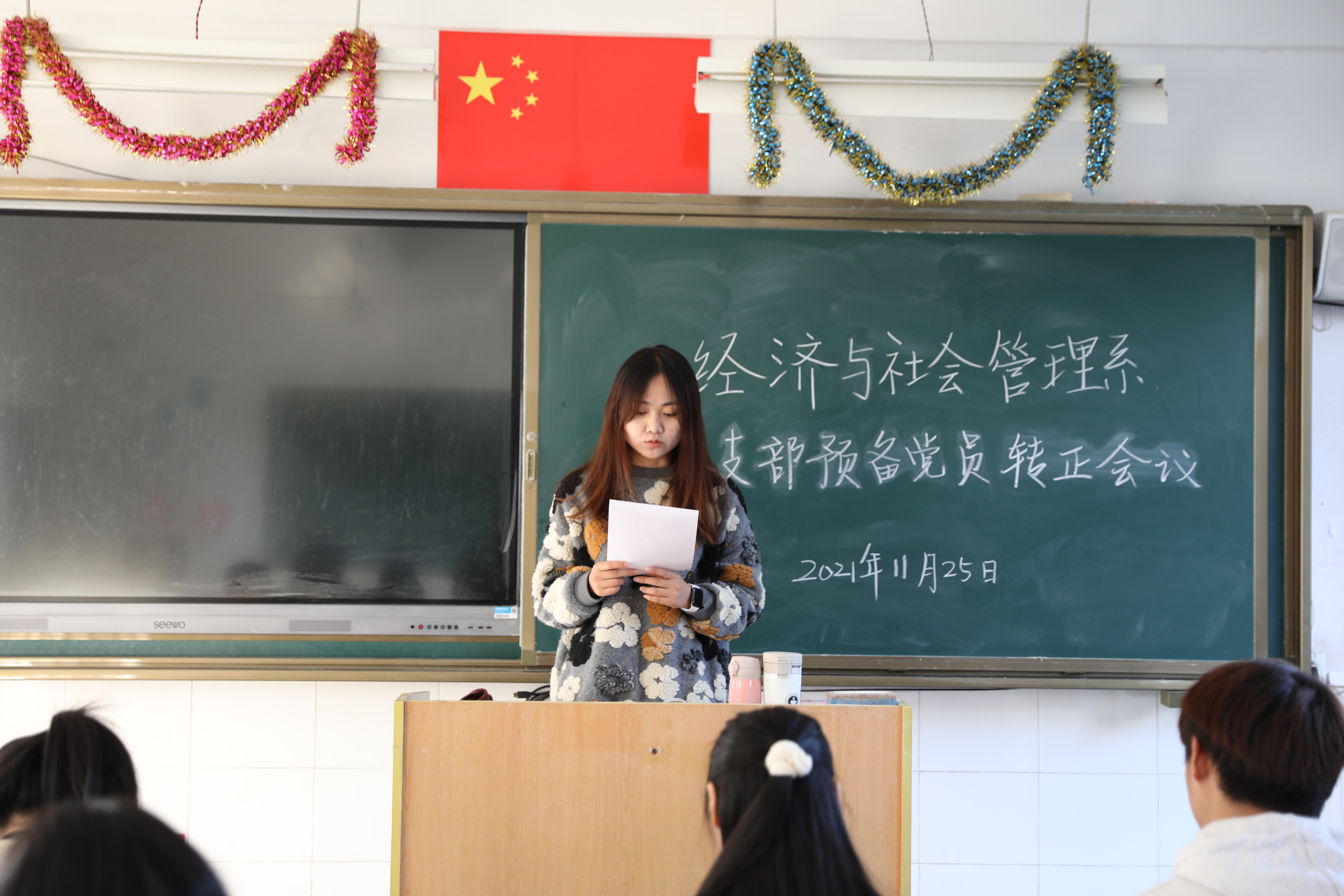 经济与社会管理系第一党支部召开预备党员转正会议 本网讯 11月25日下午,经济与社会管理系第一党支部在D204教室组织召开了2021年下半年支部预备党员转正会议。此次会议由支部书记曹本霞老师主持,会议严格按照预备党员转正有关流程进行。