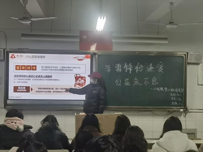 为弘扬雷锋精神,激发经管学子的社会责任感和奉献意识,3月4日晚7点,经济与管理学院团总支组织开展了以“学雷锋传递爱,公益心永不息”为主题的团日活动。 活动中,23级研学旅行管理与服务班的徐紫嫣通过PPT,生动形象地向同学们展示了雷锋短暂而光辉的一生。从雷锋苦难的童年经历到他在工作岗位上的无私奉献,从他乐于助人的感人故事到他崇高的共产主义信仰,让同学们深刻感受到雷锋精神的丰富内涵和时代价值。
