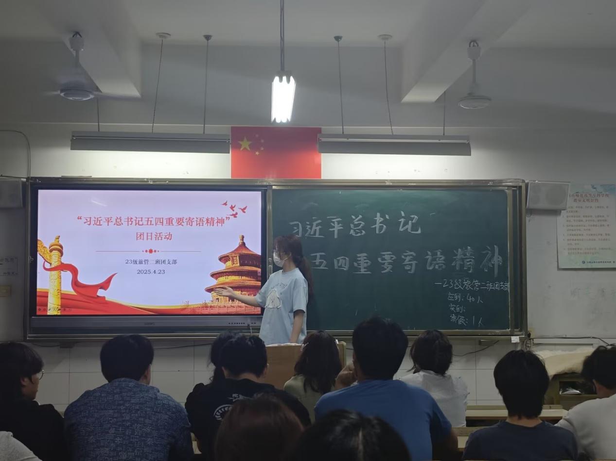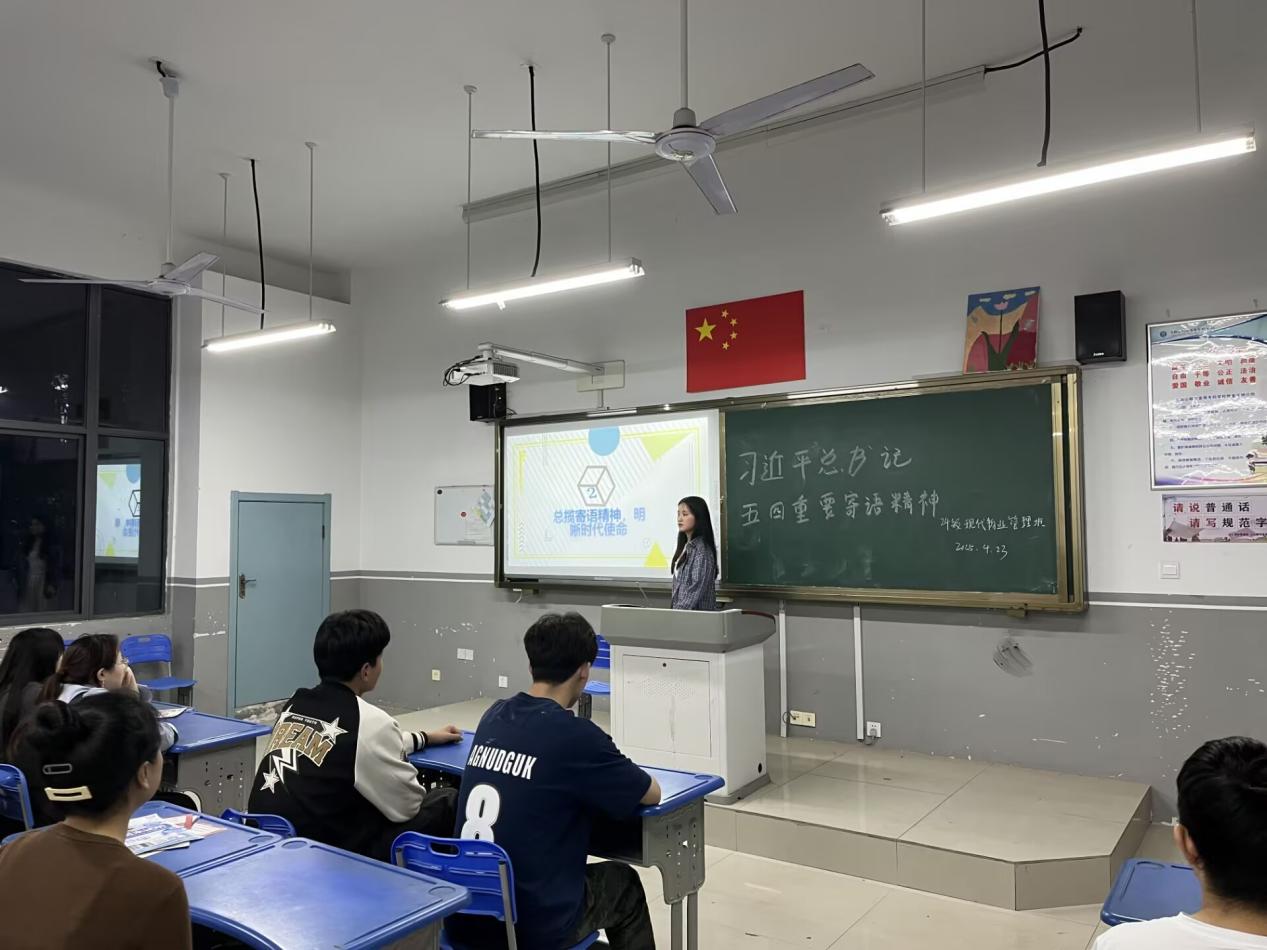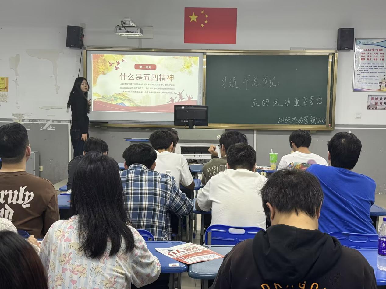 本次活动由各班团支书主持,通过精心制作的PPT和生动讲解,带领同学们深刻领会青年一代的使命与担当。2024级市场营销(2)班项远芳向同学们详细阐述了习近平总书记五四重要寄语精神的深刻内涵。她强调了当代青年人肩负的使命与担当,鼓励同学们要志存高远、脚踏实地,将个人命运与国家命运紧密相连。