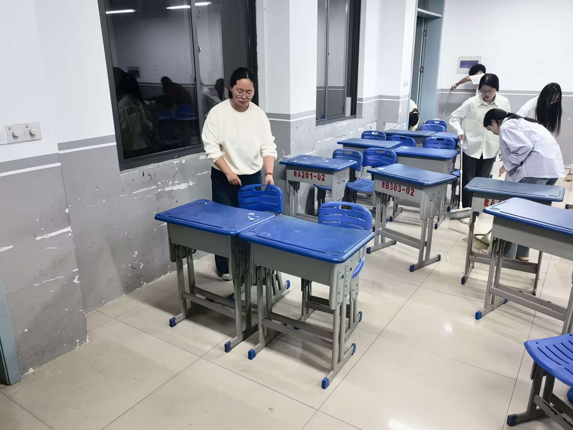 活动当天,教师党员和入党积极分子主动请缨,分成多个小组,对滨江校区教学区域展开全面清扫。第二党小组组长马倩带领学生在4月27日晚自习对备用教室进行清理,支部书记杨璇在4月28日组织学生对教室抽屉等卫生死角进行清理。大家分工协作,干劲十足:有的擦拭黑板、整理讲台,有的清扫地面垃圾、清理卫生死角,有的搬运杂物垃圾,还有的仔细检查门窗、电源设施,确保教学环境安全整洁。师生们发扬不怕脏、不怕累的精神,以饱满的热情投入劳动,使滨江校区教学场所焕然一新,为师生营造了更加舒适的教学环境。