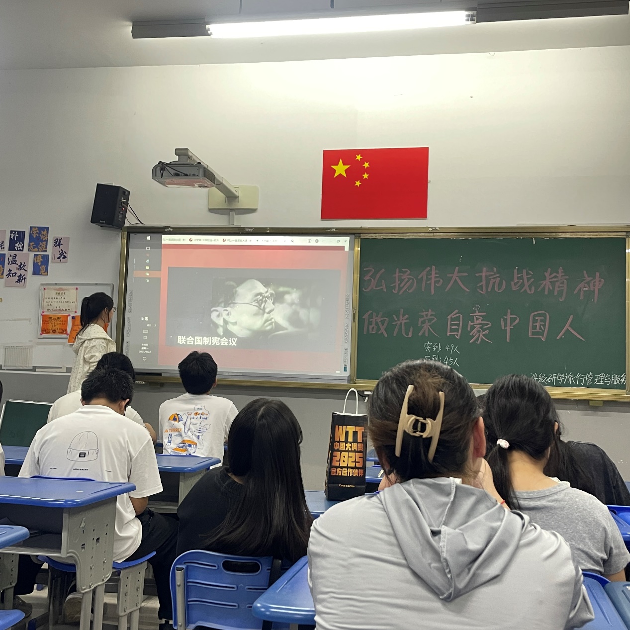 本次活动由各班团支书主持,通过观看PPT大国担当视频,带领经管学子牢记抗战历史,弘扬抗战精神。2024级电子商务班王冰冰强调:“伟大抗战精神是中国人民在抗日战争的壮阔进程中孕育出来的,永远是激励中国人民克服一切艰难险阻、为实现中华民族伟大复兴而奋斗的强大精神动力。”