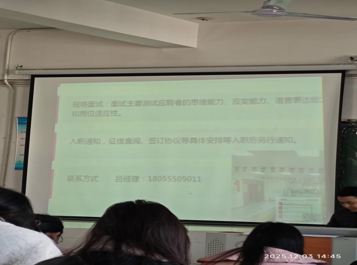 为深化校企合作、拓宽毕业生就业渠道,12月3日,中国人民财产保险股份有限公司马鞍山分公司走进马鞍山师范高等专科学校,面向经管学院23级毕业班学生举办2025年校园招聘宣讲会,搭建人才供需“直通车”。
